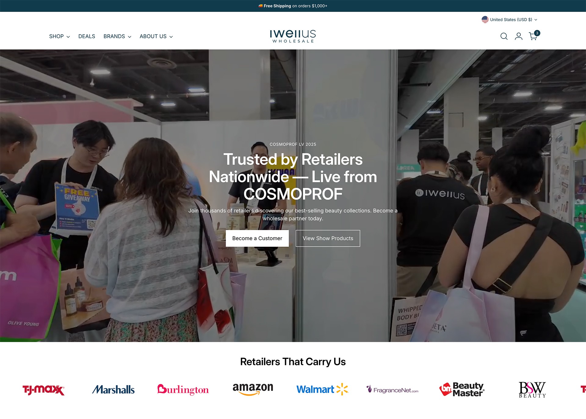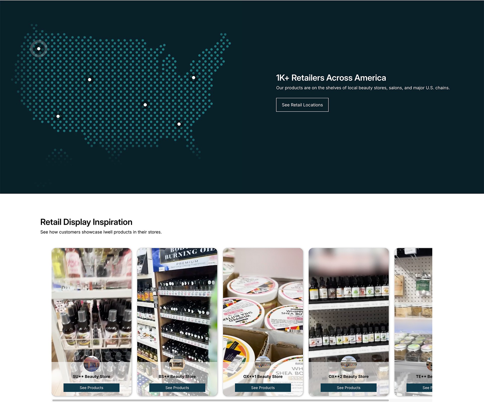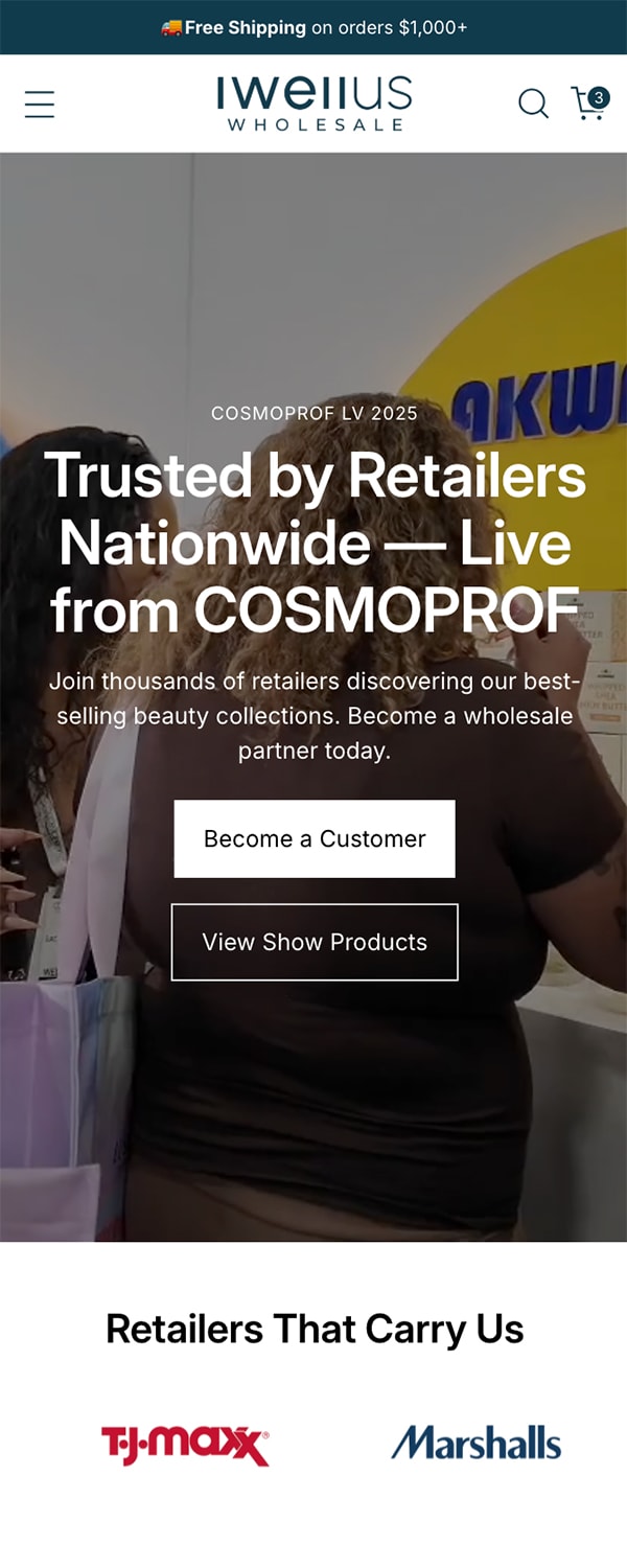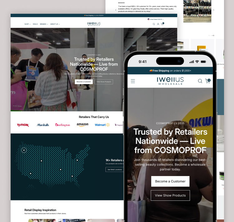 Homepage designed to build retailer trust through clear company info and brand messaging.