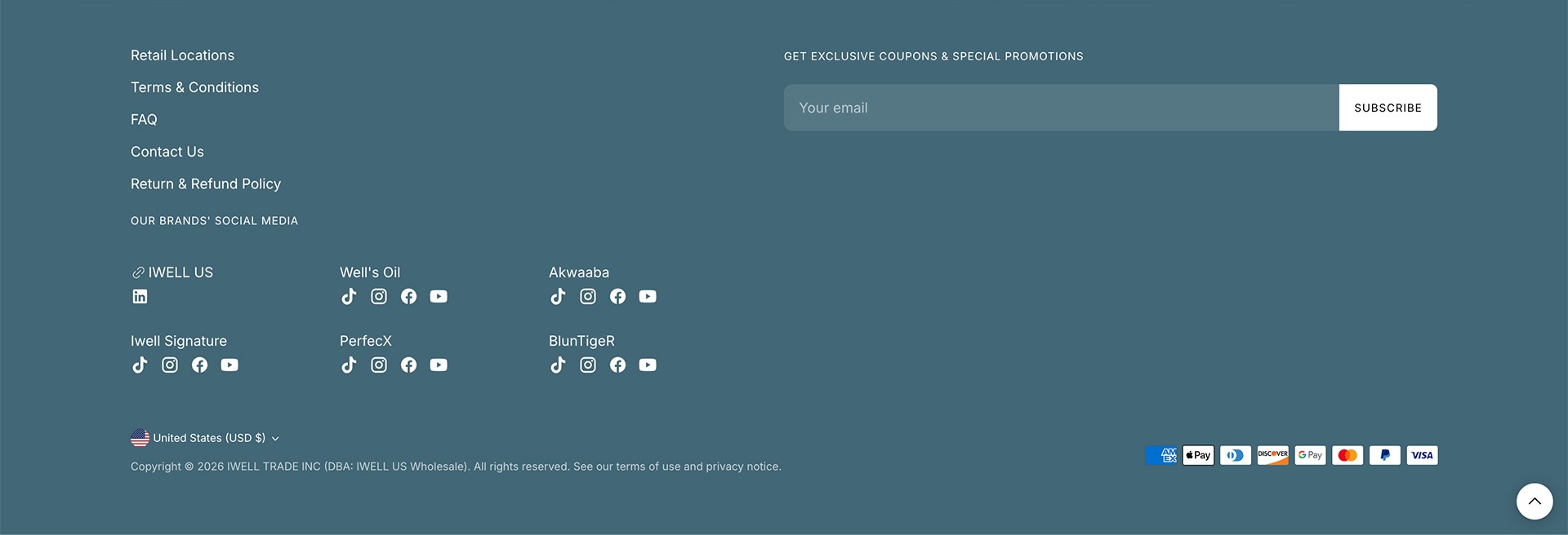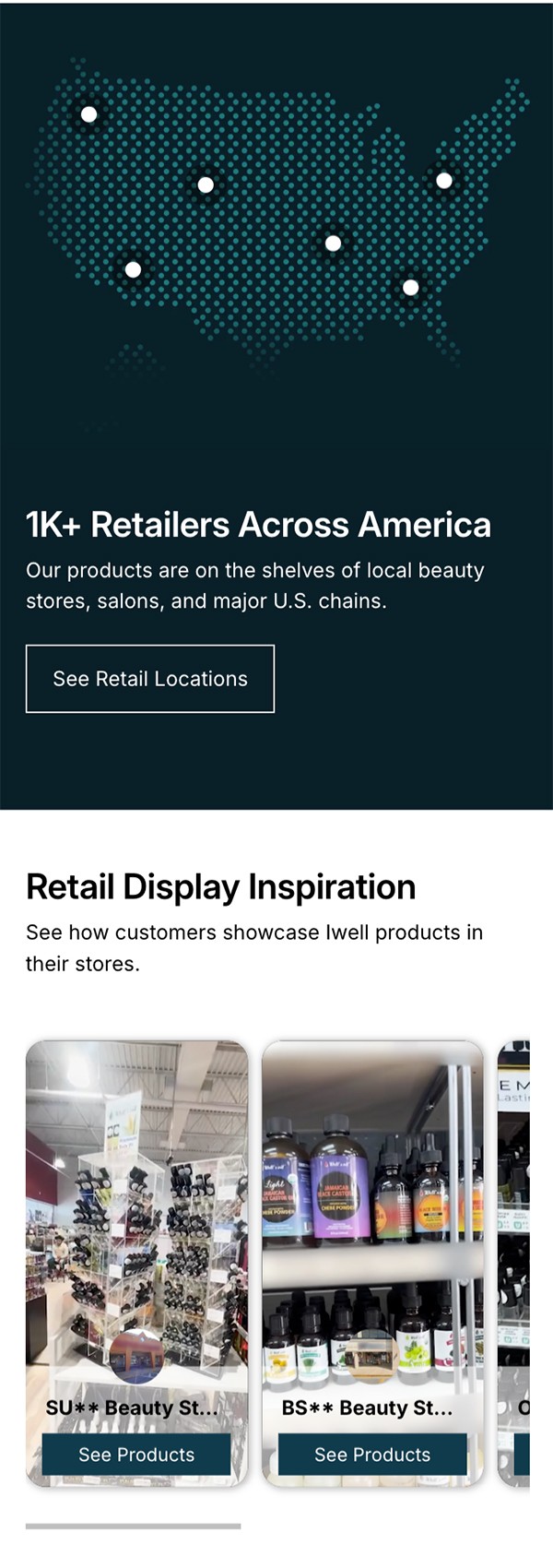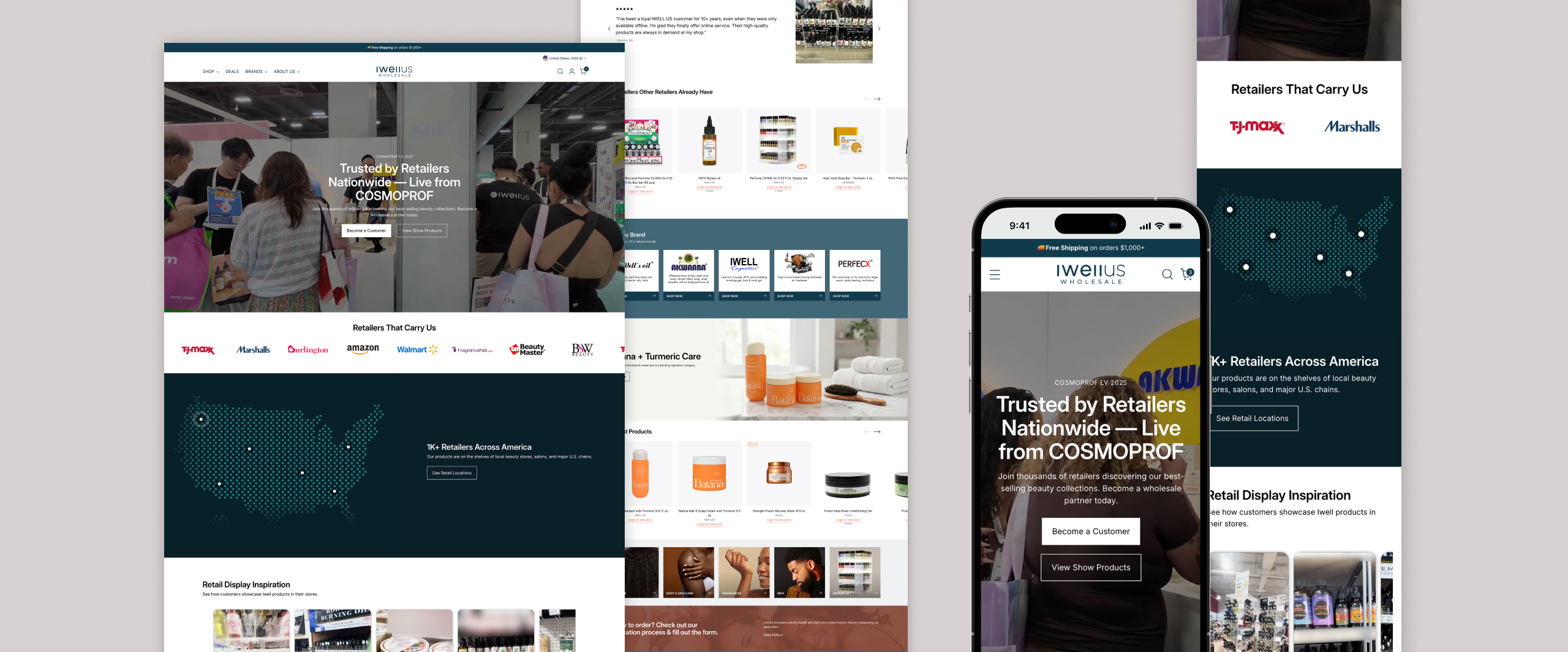 Homepage designed to build retailer trust through clear company info and brand messaging.