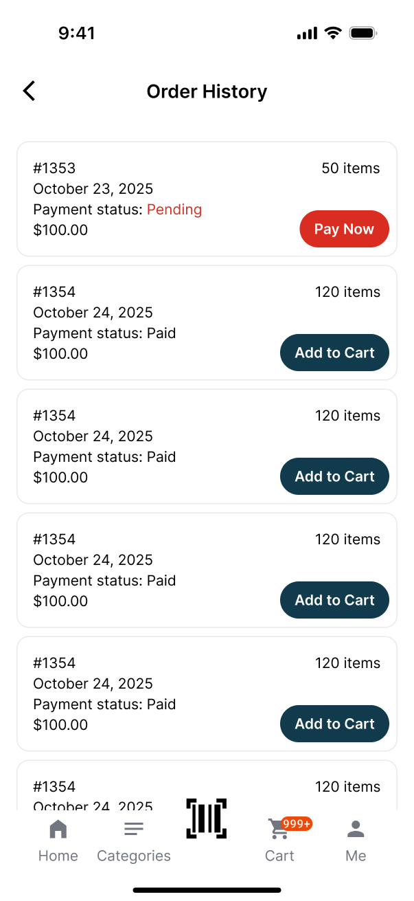 Enabled fast refills through barcode scanning from retailer shelves and one-click reordering from order history.